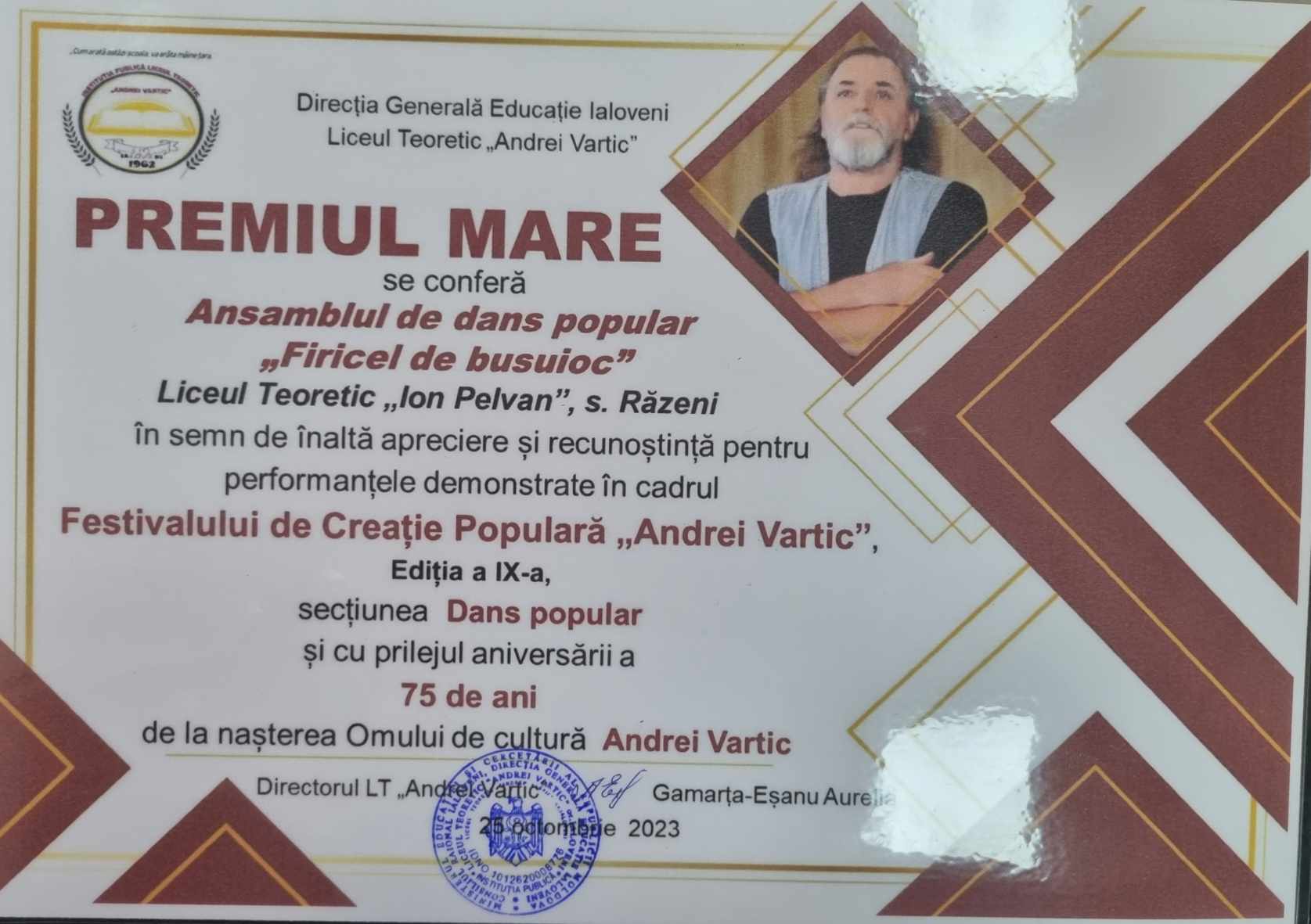Ansamblul de dans „Firicel de busuioc” al liceului , a obținut Premiul Mare la Festivalul Raional de Creație Populară „Andrei Vartic”, ediția a IX-a, organizat în luna octombrie de către Liceul Teoretic „Andrei Vartic”, Ialoveni, cu prilejul aniversării a 75 de ani de la nașterea personalității notorii, Omului de cultură, Andrei Vartic.